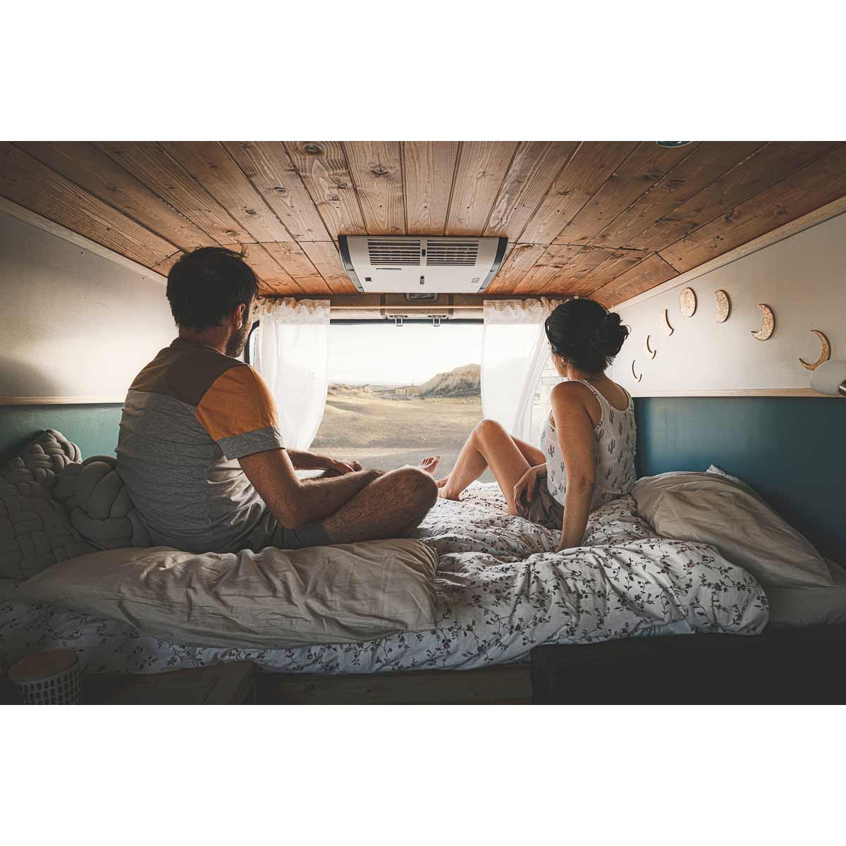 A unique 12V roof air conditioner designed for use in campervans, motorhomes and van conversions up to 6 metres. This air conditioner is ideal for cooling and dehumidifying the sleeping area of a vehicle, rather than the entire vehicle as with traditional AC air conditioning units. It can also be used in the sleeping areas of larger vehicles that do not exceed 9m3 in size.
