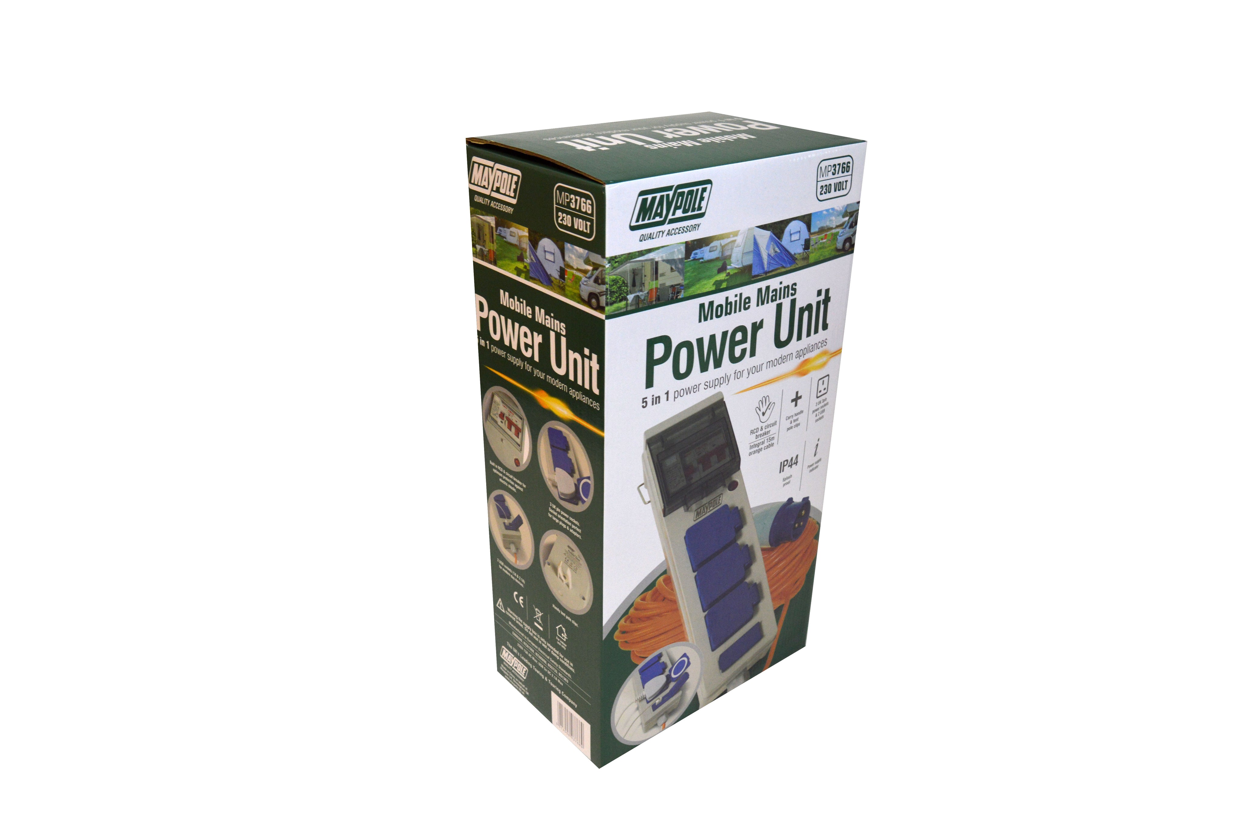 This robust mobile mains power unit from Maypole delivers a versatile and safe mains supply point for caravans, motorhomes, awnings, tents and camping setups.