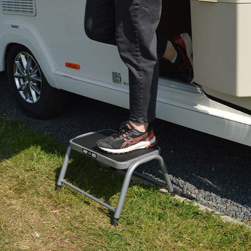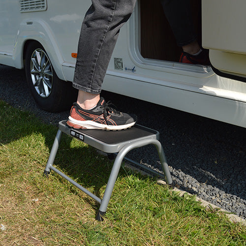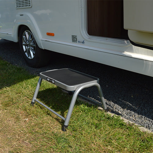 - Single steel silver caravan step with a maximum load capacity of 150Kg