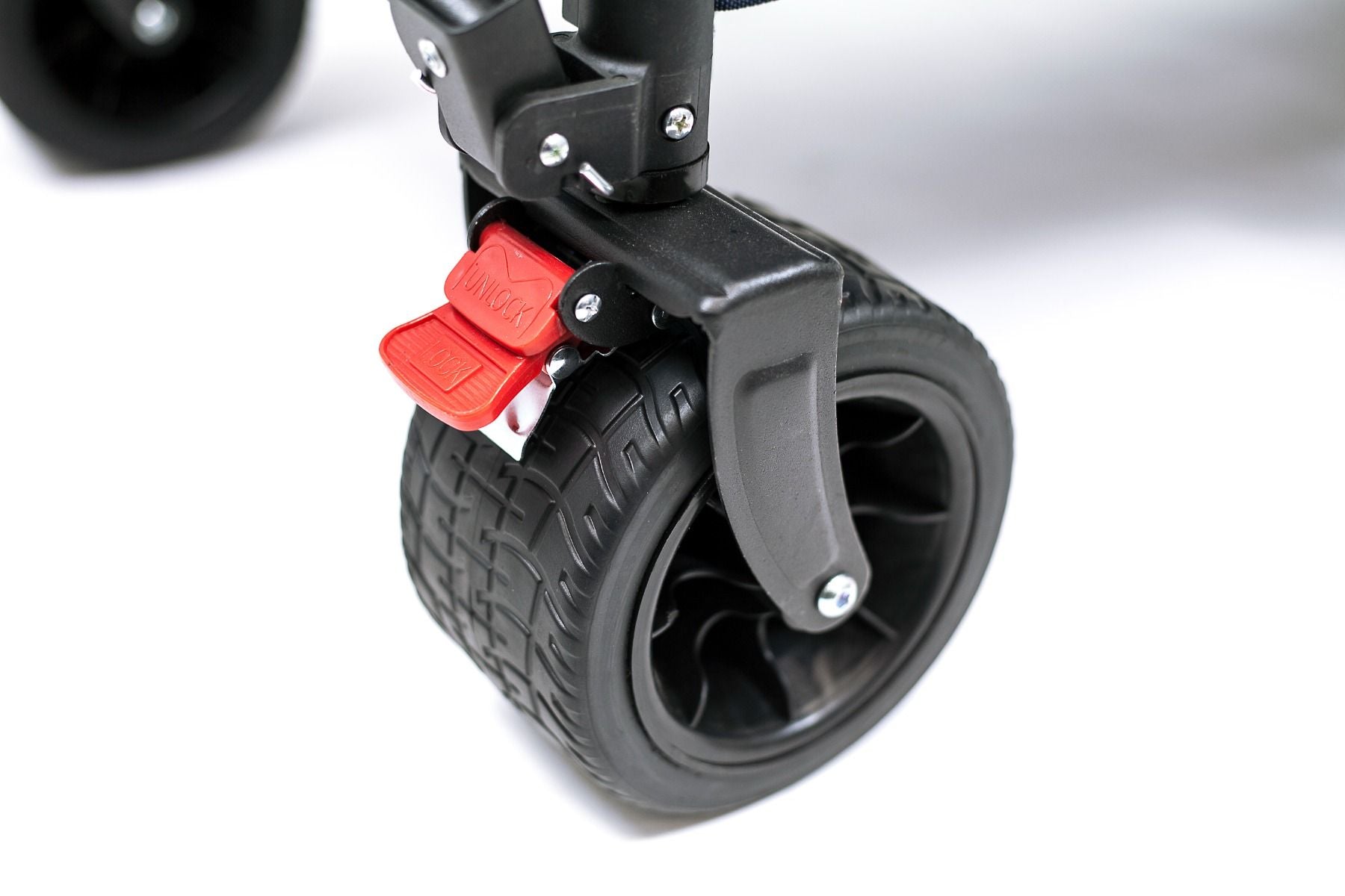 Fitted with extra wide robust detachable wheels that won’t sink into sand or mud and are fitted with a very handy brake to stop the trolley rolling away when stationary. The concertina frame system folds down to a compact size in a handy carry bag for storage and transportation.