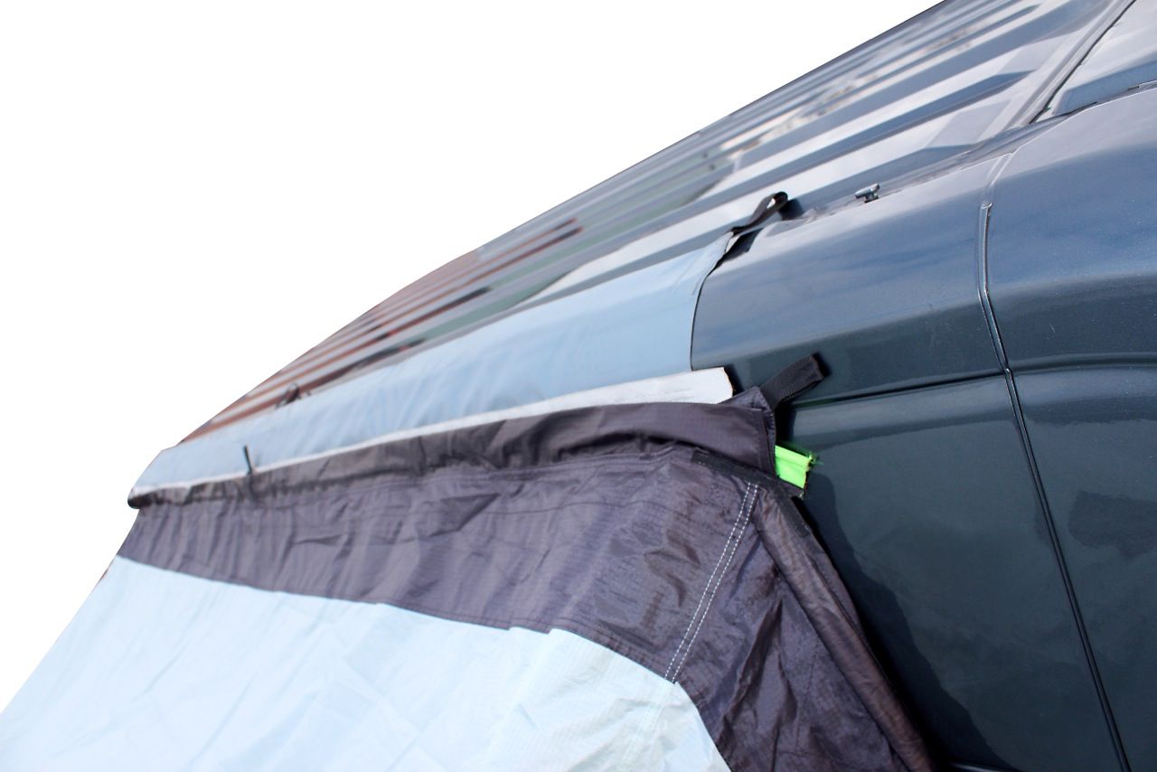 The 'Magnetic Drive-Away Strip' is the newest form of a drive away kit. Simply attach the magnetic strip to the top of your vehicle in the desired position, hold the cowl up to the other side of the strip and then thread the 'Figure of 8'  strips onto both awning piping.