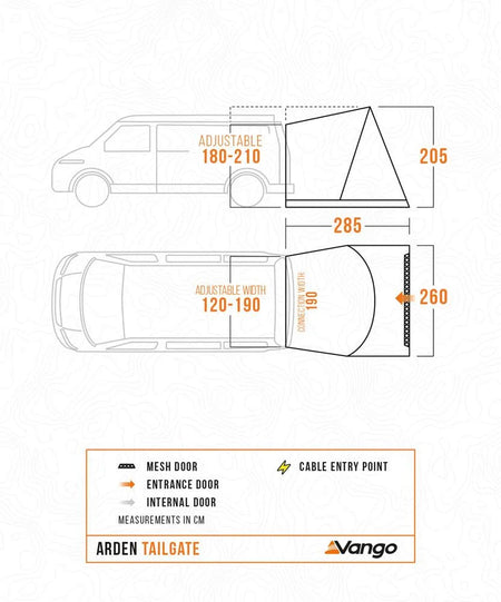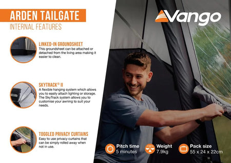 Vango's rear attachment awning, the Arden Tailgate is perfect for couples and independent travellers with the ‘Spirit of Adventure’. It is designed for a quick pitch and short stops for Low height campervans and SUV vehicles.
