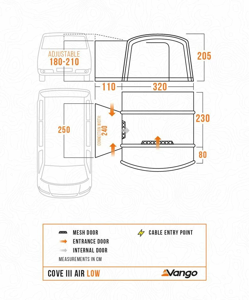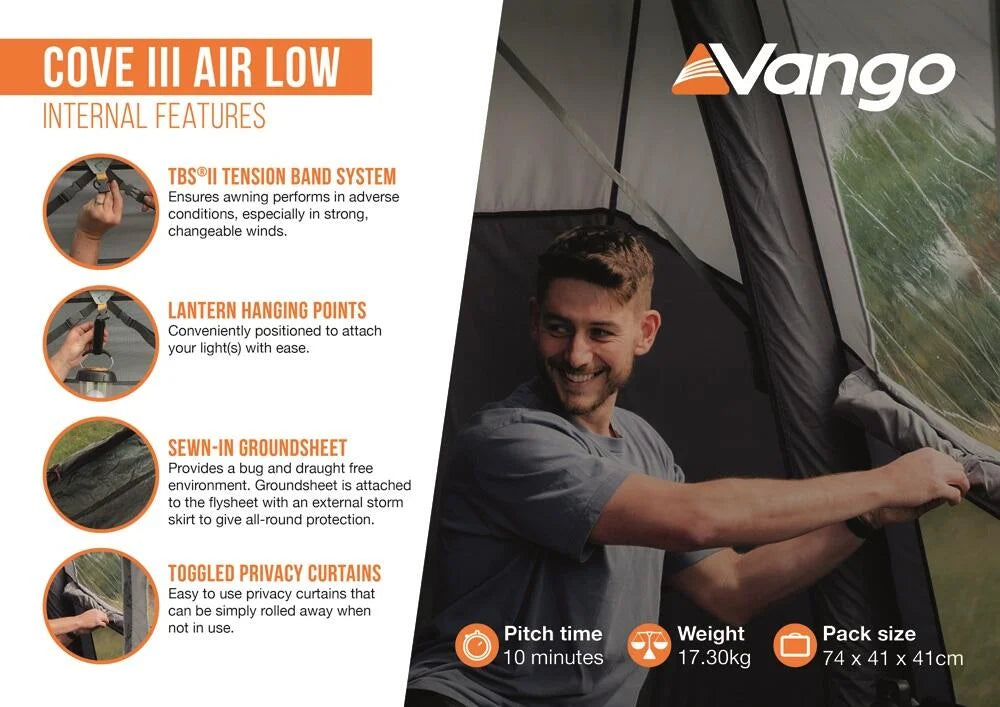 The Vango Cove III Air is the ideal size for ample storage room, socialising or creating an additional sleeping area.