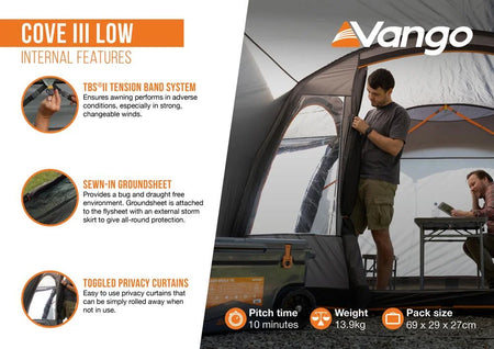 Perfect for couples and young families, the Cove is a compact awning that provides valuable extra space on weekends away.